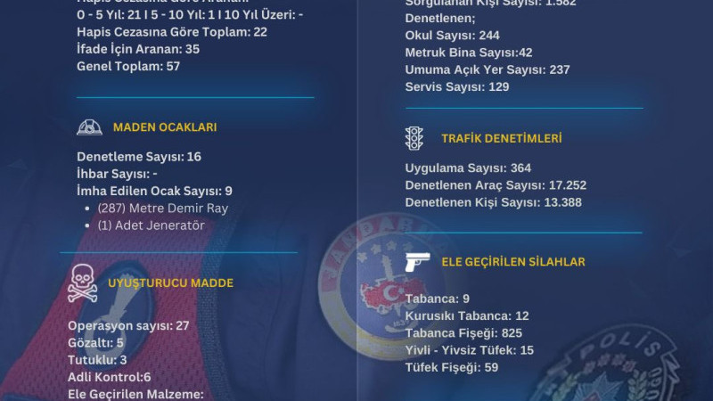 Yapılan faaliyetler arasında aranan ve yakalanan şahıslar, maden ocakları, uyuşturucu madde, okul ve çevresi denetimleri, trafik denetimleri, ele geçirilen silahlar ve düzensiz göç denetimleri yer aldı.