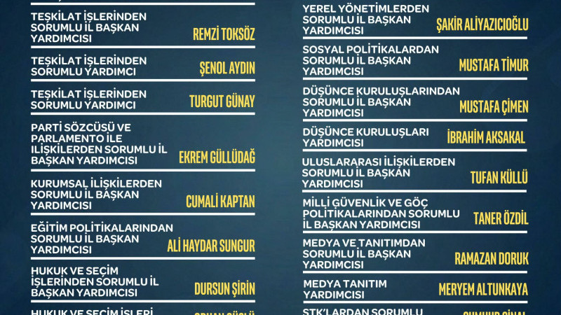 Başarı çıtası’nın her geçen gün bir üst seviye’ye yükseltildiğini ve ‘Birlikten Güç Doğar’ anlayışı ile hareket ettiklerini belirten İl Başkan Erkmen, İl Divan listesinde görevleri bulunan yönetim kurulu üyelerine başarılar diledi. Başkan Erkmen, “Bilindiği üzere esas olan yönetimdir. Liste her zaman değişebilir. Ben arkadaşlarımın, özveri gösterip en üst verimi alma konusunda gayret göstereceğine inanıyorum. Şimdi’den hayırlı olmasını diliyor, başarılar temenni ediyorum. Hep birlikte başaracağız.” İYİ Parti İl Divan Kurulu Üyeleri: